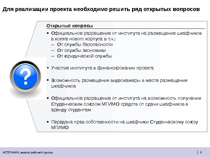| 5 ▪ Официальное разрешение от института на размещение шкафчиков в холле нового корпуса в т. ч. : – От службы безопасности – От службы экономики – От юридической службы ▪ Участие института в финансировании проекта ▪ Возможность размещения видеокамеры в месте размещения шкафчиков ▪ Официальное разрешение от института на возможность получения Студенческим союзом МГИМО средств от сдачи шкафчиков в аренду студентам ▪ Передача прав собственности на шкафчики Студенческому союзу МГИМООткрытые вопросы. Для реализации проекта необходимо решить ряд открытых вопросов ИСТОЧНИК: анализ рабочей группы