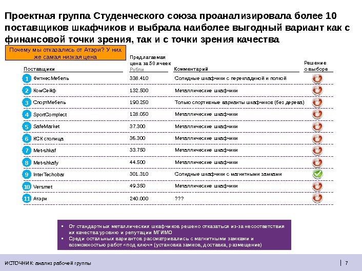 | 7 Проектная группа Студенческого союза проанализировала более 10 поставщиков шкафчиков и выбрала наиболее выгодный вариант как с финансовой точки зрения, так и с точки зрения качества ИСТОЧНИК: анализ рабочей группы ▪ От стандартных металлических шкафчиков решено отказаться из-за несоответствия их качества уровню и репутации МГИМО ▪ Среди остальных вариантов рассматривались с магнитными замками и возможностью работ «под ключ» (установка замков, доставка, размещение)1 2 3 4 5 6 7 8 9 10 11 Фитнес. Мебель. Поставщики Ком. Сейф Спорт. Мебель Sport. Complect Safe. Market КСК столица Met-shkafy Inter. Techobar Versmet Атэри Предлагаемая цена за 50 ячеек Рубли 338. 410 Комментарий Солидные шкафчики с перекладиной и полкой Решение о выборе 132. 500 Металлические шкафчики 190. 250 Только спортивные варианты шкафчиков (без дерева) 128. 050 Металлические шкафчики 37. 300 Металлические шкафчики 36. 300 Металлические шкафчики 33. 750 Металлические шкафчики 44. 500 Металлические шкафчики 301. 310 Солидные шкафчики с магнитными замками 49. 350 Металлические шкафчики 240. 000 ? ? ? Почему мы отказались от Атэри? У них же самая низкая цена