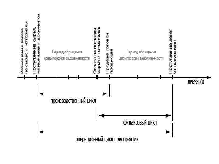 • Операционный цикл – это период полной трансформации всей суммы оборотных активов, в процессе которого происходит смена отдельных видов. Цикл имеет два отдельных периода – производственный цикл предприятия и финансовый цикл предприятия. • Производственный цикл характеризует период полного оборота материальных элементов, используемых для обслуживания производственного процесса, начиная с момента поступления сырья, материалов и, их переработки и отгрузки покупателю • Финансовый цикл предприятия представляет собой период полного оборота денежных средств, инвестированных в оборотные активы, начиная с момента оплаты за сырье, материалы и полуфабрикаты, и заканчивая получением денег за отгруженную продукцию.