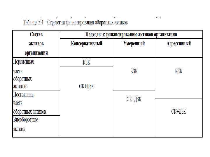 1. Консервативный подход предполагает не только полную обеспеченность оборотными активами в любой момент времени, но и создание значительных резервов на случай непредвиденных ситуаций. При консервативном варианте постоянная часть оборотного капитала и часть временной покрывается за счет собственных источников , а временная часть – за счет заемных средств. Плюсы Простота привлечения средств Предприятие имеет высокий уровень устойчивости и низкий уровень возможного банкротства Предприятие получает относительно большую величину частой прибыли Минусы Ограниченные возможности экономического роста Предприятие имеет меньшие возможности для реагирования на изменение рыночной конъюнктуры.