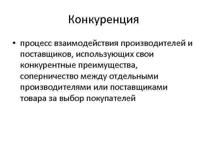 Конкуренция • процесс взаимодействия производителей и поставщиков, использующих свои конкурентные преимущества, соперничество между отдельными производителями или поставщиками товара за выбор покупателей