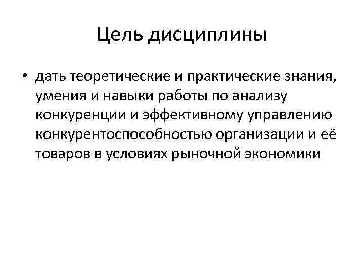 Цель дисциплины • дать теоретические и практические знания, умения и навыки работы по анализу конкуренции и эффективному управлению конкурентоспособностью организации и её товаров в условиях рыночной экономики