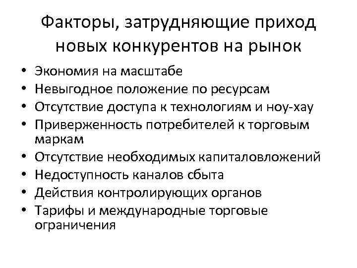 Факторы, затрудняющие приход новых конкурентов на рынок • • Экономия на масштабе Невыгодное положение по ресурсам Отсутствие доступа к технологиям и ноу-хау Приверженность потребителей к торговым маркам Отсутствие необходимых капиталовложений Недоступность каналов сбыта Действия контролирующих органов Тарифы и международные торговые ограничения