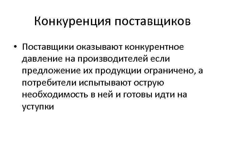 Конкуренция поставщиков • Поставщики оказывают конкурентное давление на производителей если предложение их продукции ограничено, а потребители испытывают острую необходимость в ней и готовы идти на уступки