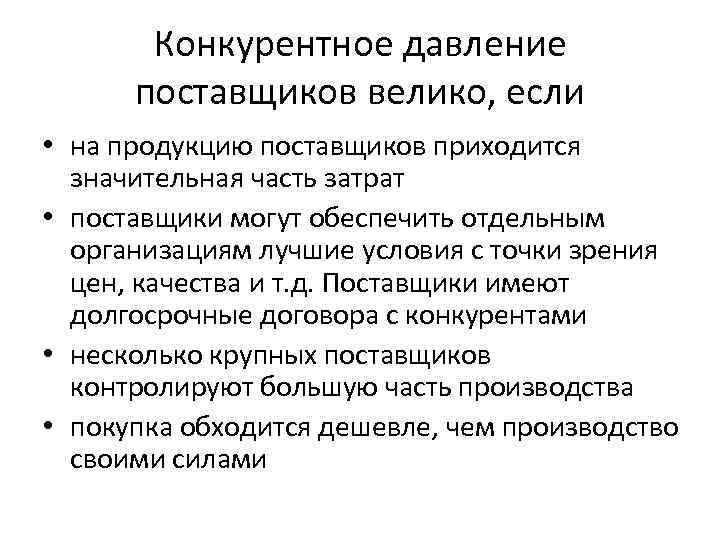 Конкурентное давление поставщиков велико, если • на продукцию поставщиков приходится значительная часть затрат • поставщики могут обеспечить отдельным организациям лучшие условия с точки зрения цен, качества и т. д. Поставщики имеют долгосрочные договора с конкурентами • несколько крупных поставщиков контролируют большую часть производства • покупка обходится дешевле, чем производство своими силами
