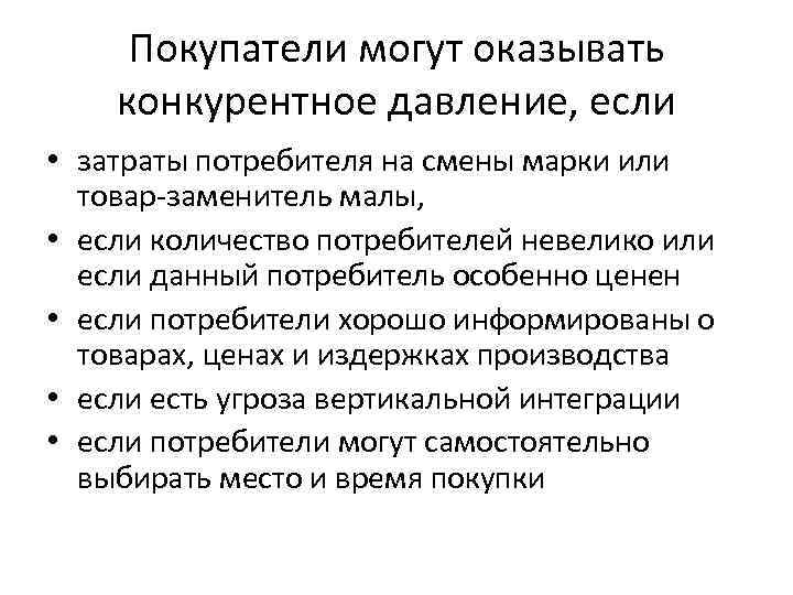 Покупатели могут оказывать конкурентное давление, если • затраты потребителя на смены марки или товар-заменитель малы, • если количество потребителей невелико или если данный потребитель особенно ценен • если потребители хорошо информированы о товарах, ценах и издержках производства • если есть угроза вертикальной интеграции • если потребители могут самостоятельно выбирать место и время покупки