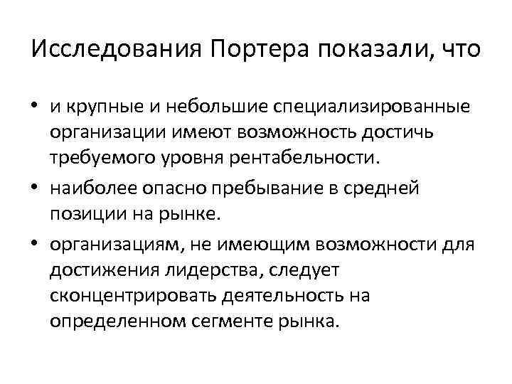 Исследования Портера показали, что • и крупные и небольшие специализированные организации имеют возможность достичь требуемого уровня рентабельности. • наиболее опасно пребывание в средней позиции на рынке. • организациям, не имеющим возможности для достижения лидерства, следует сконцентрировать деятельность на определенном сегменте рынка.