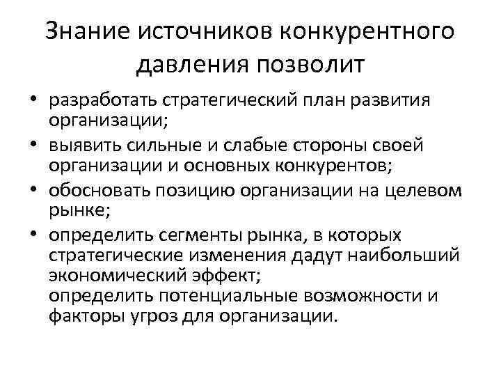 Знание источников конкурентного давления позволит • разработать стратегический план развития организации; • выявить сильные и слабые стороны своей организации и основных конкурентов; • обосновать позицию организации на целевом рынке; • определить сегменты рынка, в которых стратегические изменения дадут наибольший экономический эффект; определить потенциальные возможности и факторы угроз для организации.