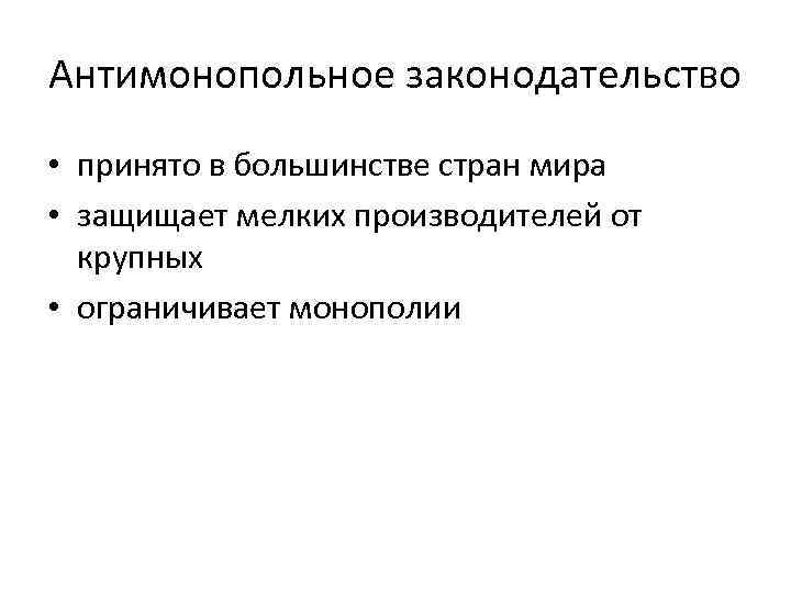 Антимонопольное законодательство • принято в большинстве стран мира • защищает мелких производителей от крупных • ограничивает монополии