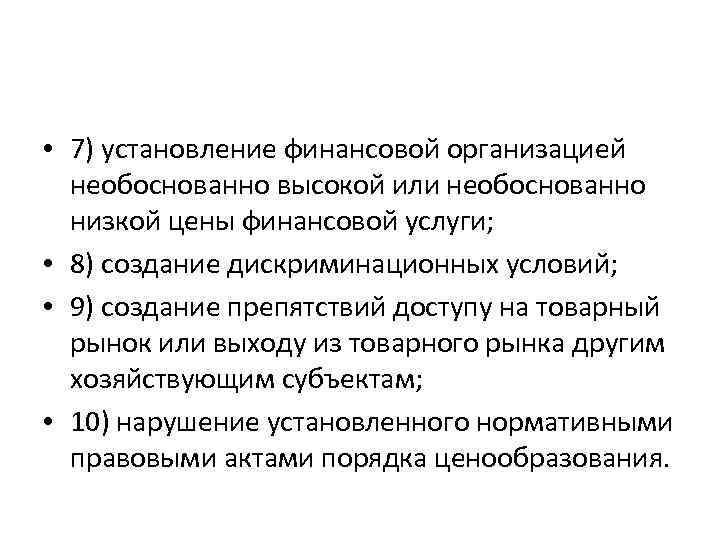 • 7) установление финансовой организацией необоснованно высокой или необоснованно низкой цены финансовой услуги; • 8) создание дискриминационных условий; • 9) создание препятствий доступу на товарный рынок или выходу из товарного рынка другим хозяйствующим субъектам; • 10) нарушение установленного нормативными правовыми актами порядка ценообразования.