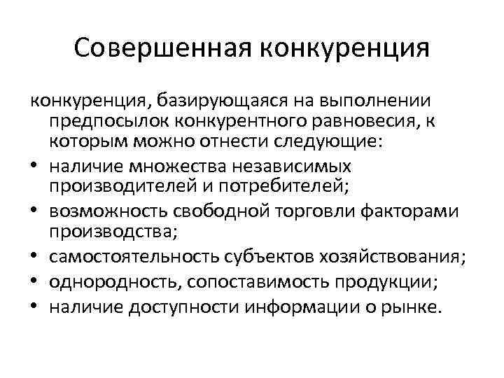 Совершенная конкуренция, базирующаяся на выполнении предпосылок конкурентного равновесия, к которым можно отнести следующие: • наличие множества независимых производителей и потребителей; • возможность свободной торговли факторами производства; • самостоятельность субъектов хозяйствования; • однородность, сопоставимость продукции; • наличие доступности информации о рынке.