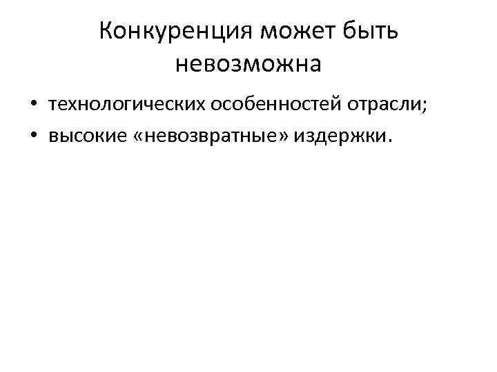 Конкуренция может быть невозможна • технологических особенностей отрасли; • высокие «невозвратные» издержки.