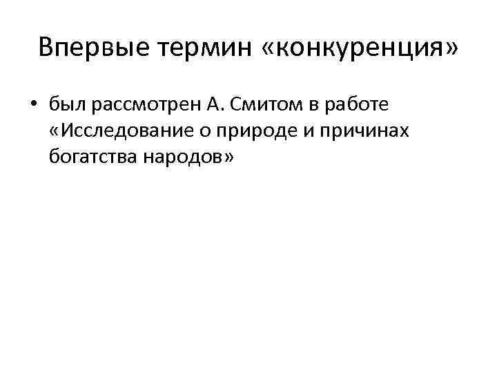 Впервые термин «конкуренция» • был рассмотрен А. Смитом в работе «Исследование о природе и причинах богатства народов»