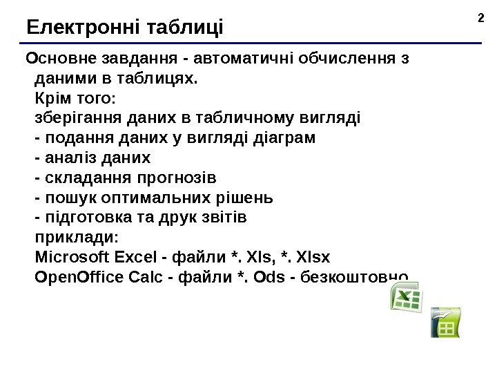 2 Електронні таблиці Основне завдання — автоматичні обчислення з даними в таблицях. Крім того: зберігання даних в табличному вигляді — подання даних у вигляді діаграм — аналіз даних — складання прогнозів — пошук оптимальних рішень — підготовка та друк звітів приклади: Microsoft Excel — файли *. Xls, *. Xlsx Open. Office Calc — файли *. Ods — безкоштовно