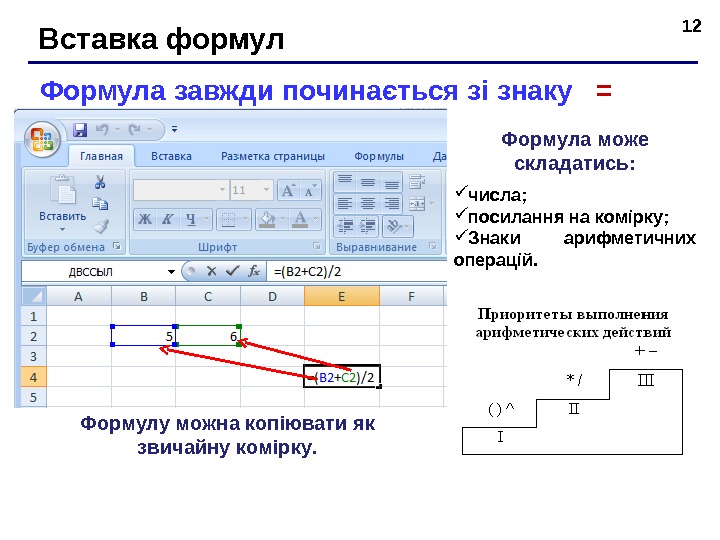 12 Вставка формул Формула завжди по чина є т ь ся зі знак у = Формула може складатись : числа; посилання на комірку ; Знак и ари фметичних операцій. Формулу можн а коп іювати я к звичайну комірку.