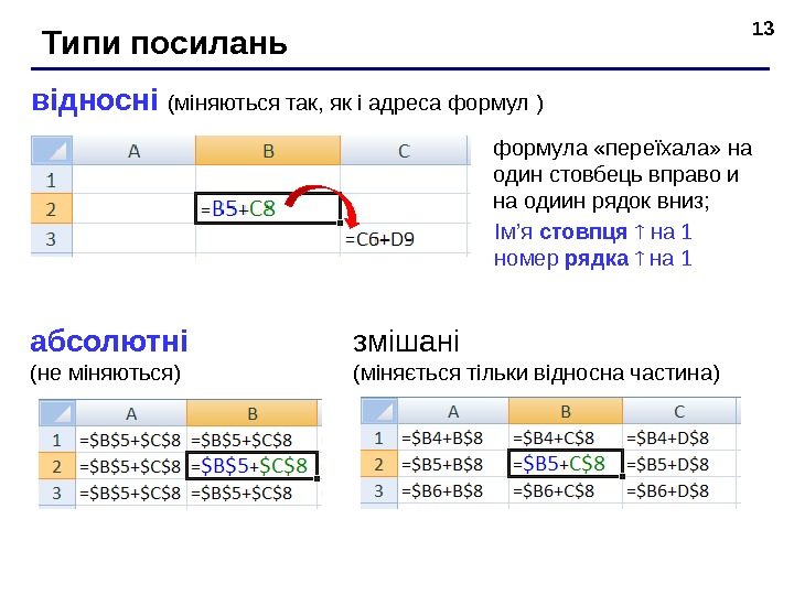 13 Типи посилань відносні ( міняються так, як і адреса формул ) формула «пере їхала » на один сто вбець вправо и на од иин рядок вниз; абсолют ні (не м і няют ь ся) змішані (м іняється тільки відносна частина )І м ’ я стовпця на 1 номер рядка на