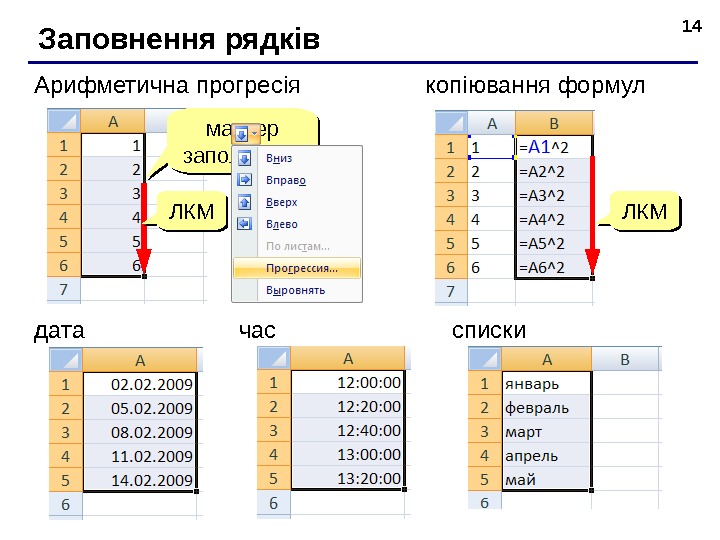 14 Запо внення рядків Ари фметична прогресія маркер заполнения коп іювання формул ЛКМЛКМ дат а списк ичас. ЛКМЛКМ