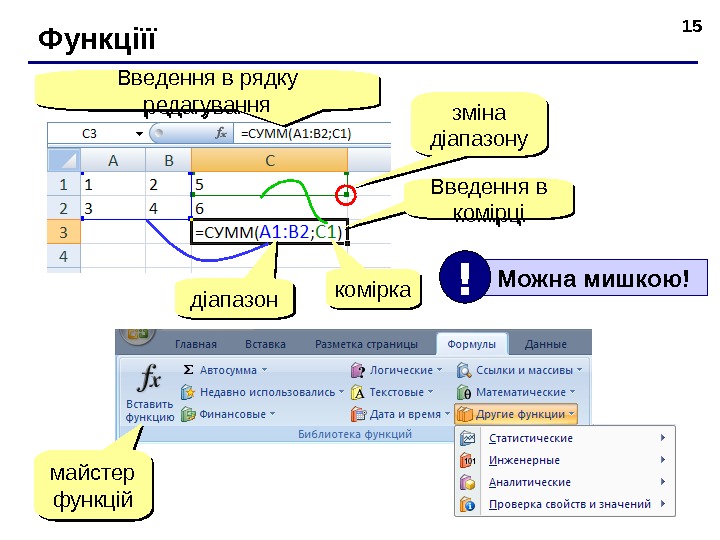 15 Функц іїї Вв едення в комірціВв едення в рядку реда гування д і апазон комірка зміна д іапазону ма йстер функц і й Мож на мишкою ! !