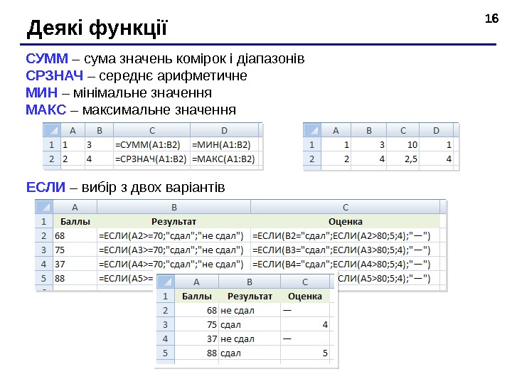 16 Деякі функц ії СУММ – сум а значень комірок і діапазонів СРЗНАЧ – с ереднє арифметичне МИН – м інімальне значення МАКС – макси мальне значення ЕСЛИ – в ибір з двох варіантів