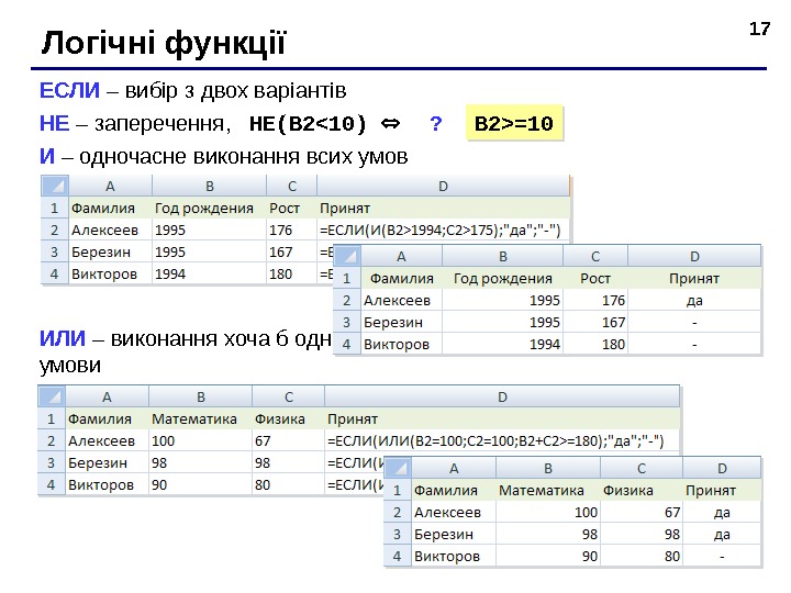17 Лог ічні функції ЕСЛИ – в ибір з двох варіантів НЕ – заперечення , НЕ( B 2=