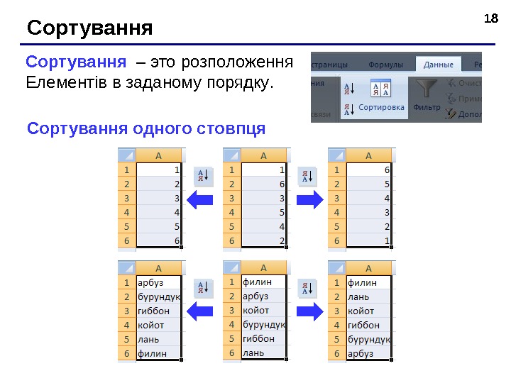 18 Сор тування – это р озположення Елементів в заданому порядку. Сор тування одного стовпця