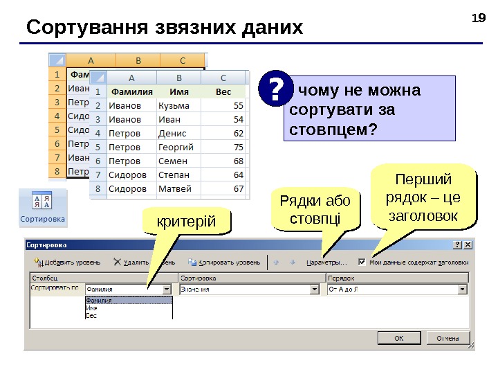 19 Сортування звязних даних чому не можна сортувати за стовпцем ? ? критер ій Рядки або стовпці П ерший рядок – це заголовок