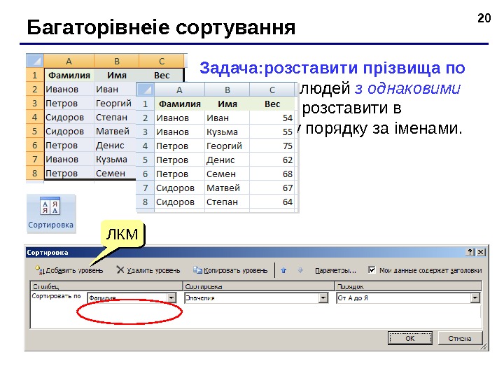 20 Багаторівнеіе сортування Задача: розставити прізвища по алфавіту , а людей з однаковими прізвищами, р озставити в алфавітному порядку за іменами. ЛКМЛКМ