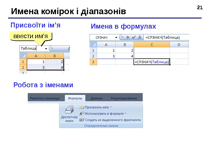 21 Имена комірок і діапазонів Присвоїти ім’ я ввести им ’ я Имена в формулах Робота з і менами