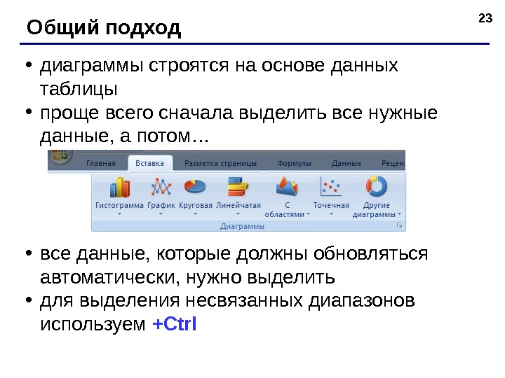 • диаграммы строятся на основе данных таблицы • проще всего сначала выделить все нужные данные, а потом… • все данные, которые должны обновляться автоматически, нужно выделить • для выделения несвязанных диапазонов используем +Ctrl 23 Общий подход