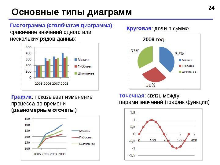 24 Основные типы диаграмм Гистограмма (столбчатая диаграмма) : сравнение значений одного или нескольких рядов данных График : показывает изменение процесса во времени ( равномерные отсчеты ) Круговая : доли в сумме Точечная : связь между парами значений (график функции)