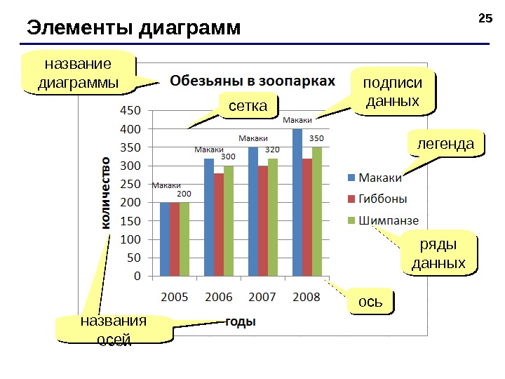 25 Элементы диаграмм название диаграммы легенда ряды данных осьосьсетка названия осей подписи данных