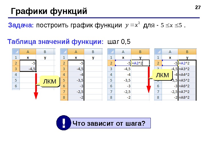 27 Графики функций Задача: построить график функции для . 2 xy 55 x Таблица значений функции: шаг 0, 5 Что зависит от шага? !ЛКМЛКМ