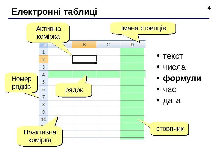 4 Електронні таблиці Номер рядків рядок ст овпчикІмена стовпців Акти вна комірка Неактивна комірка • текст • числа • формул и • час • дата