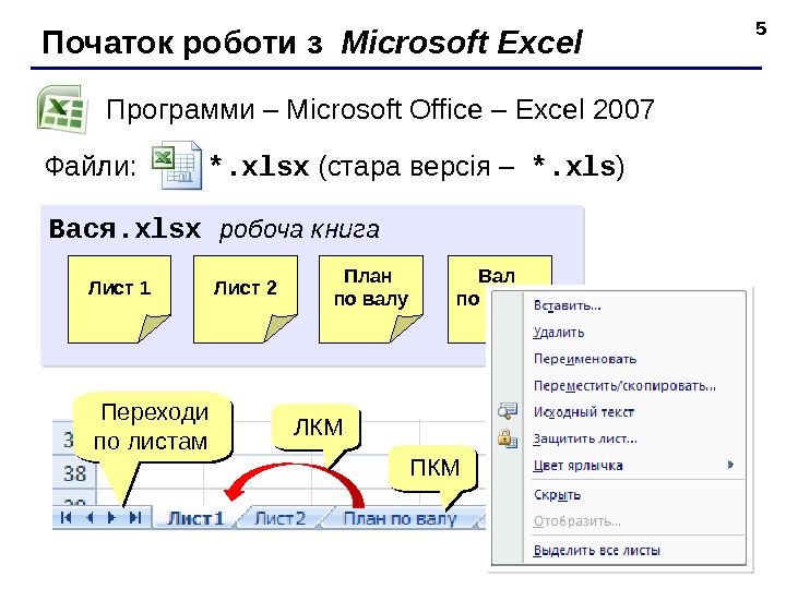 5 Початок роботи з Microsoft Excel Программ и – Microsoft Office – Excel 2007 Файл и : *. xlsx ( стара верс і я – *. xls ) Вася. xlsx р обоча книга Лист 1 Лист 2 План по валу Вал по плану Переход и по листам ЛКМЛКМ ПКМПКМ новый лист