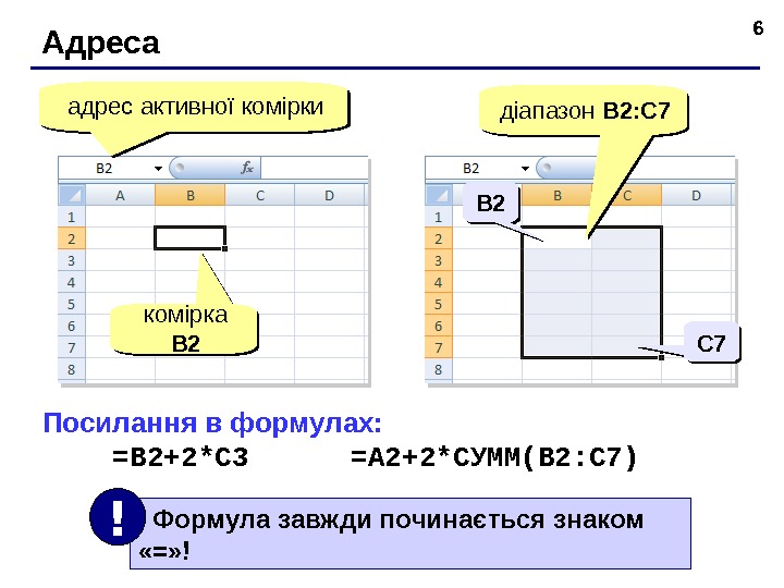 6 Адреса адрес активно ї комірки комірка B 2 д і апазон B 2 : С 7 Посилання в формулах: = B 2+2*C 3 = A 2+2* СУММ( B 2: C 7)B 2 B 2 С 7 С 7 Формула завжди по чина є т ь ся знаком «=» !!