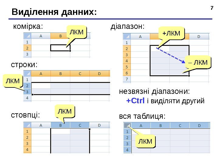 7 В иділення данних: комірка : +ЛКМ – ЛКМд і апазон: вся таблиц я : ЛКМЛКМстроки: ЛКМЛКМ сто впці : ЛКМЛКМ не звязні д і апазон и : + Ctrl і виділяти другий