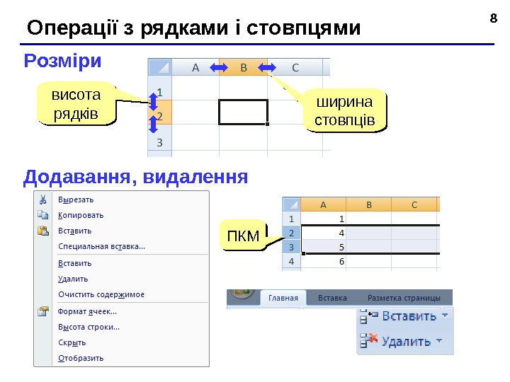 8 Операц ії з рядками і стовпцями Р озміри в и сота рядків ширина сто впців До давання, видалення ПКМПКМ