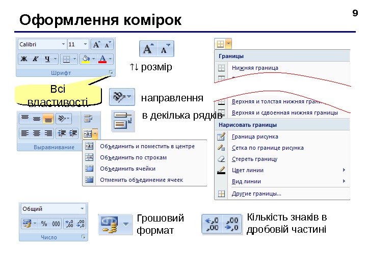 9 Оформлення комірок Вс і властивості р озмір напр авлення в декілька рядків Грошовий формат Кількість знаків в дробовій части ні