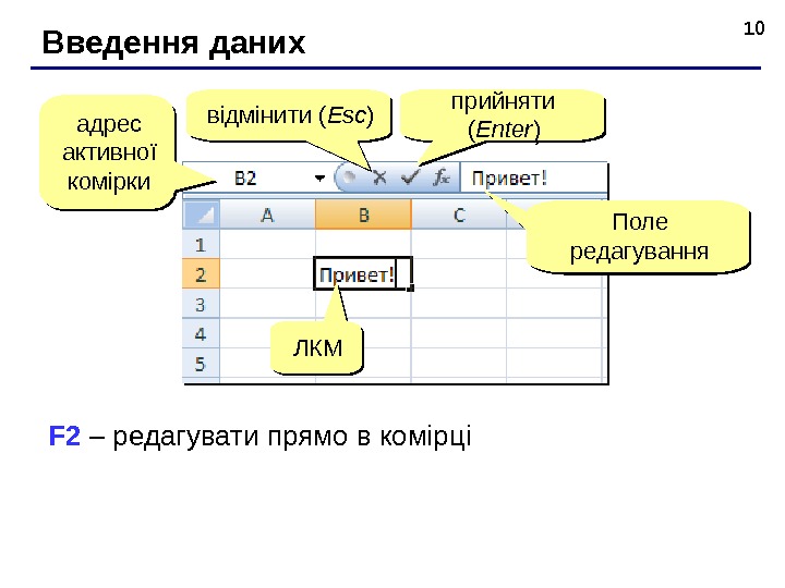 10 В ведення даних адрес активно ї комірки відмінити ( Esc ) прийняти ( Enter ) Поле реда гування ЛКМЛКМ F 2 – редагувати прямо в комірці