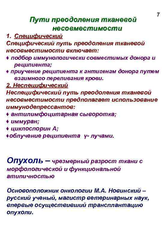 Пути преодоления тканевой несовместимости 7 1. Специфический путь преодоления тканевой несовместимости включает: ♦ подбор иммунологически совместимых донора и реципиента; ♦ приучение реципиента к антигенам донора путем взаимного переливания крови. 2. Неспецифический путь преодоления тканевой несовместимости предполагает использование иммунодепрессантов: ♦ антилимфоцитарная сыворотка; ♦ иммуран; ♦ циклоспорин А; ♦облучение реципиента ү- лучами. Опухоль – чрезмерный разрост ткани с морфологической и функциональной атипичностью Основоположник онкологии М. А. Новинский – русский ученый, магистр ветеринарных наук, впервые осуществивший трансплантацию опухоли.