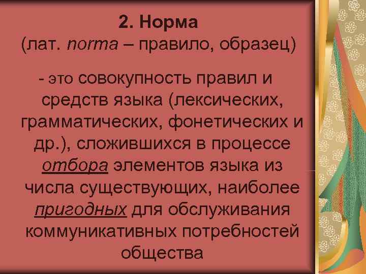 2. Норма (лат. norma – правило, образец) - это совокупность правил и средств языка (лексических, грамматических, фонетических и др. ), сложившихся в процессе отбора элементов языка из числа существующих, наиболее пригодных для обслуживания коммуникативных потребностей общества