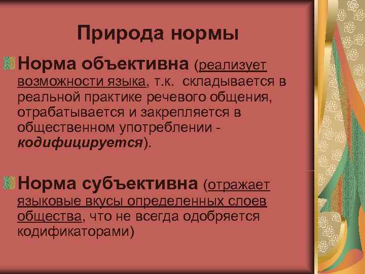 Природа нормы Норма объективна (реализует возможности языка, т. к. складывается в реальной практике речевого общения, отрабатывается и закрепляется в общественном употреблении - кодифицируется). Норма субъективна (отражает языковые вкусы определенных слоев общества, что не всегда одобряется кодификаторами)