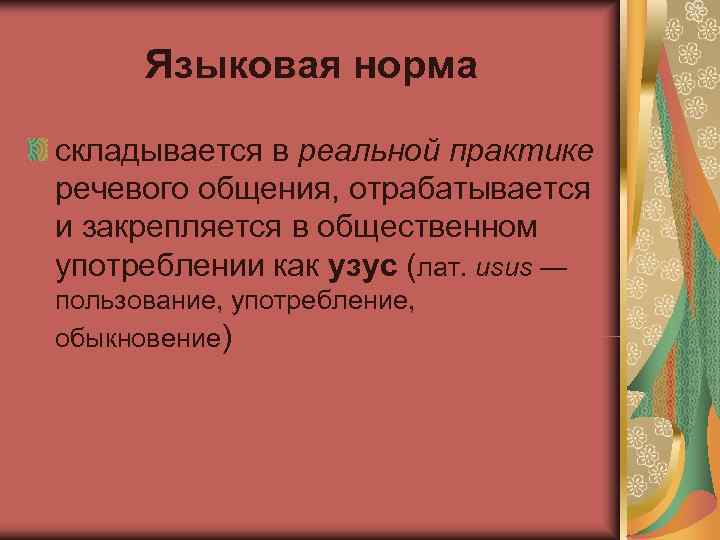 Языковая норма складывается в реальной практике речевого общения, отрабатывается и закрепляется в общественном употреблении как узус (лат. usus — пользование, употребление, обыкновение)
