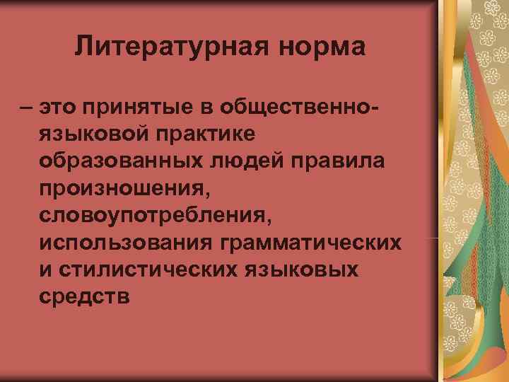 Литературная норма – это принятые в общественно- языковой практике образованных людей правила произношения, словоупотребления, использования грамматических и стилистических языковых средств