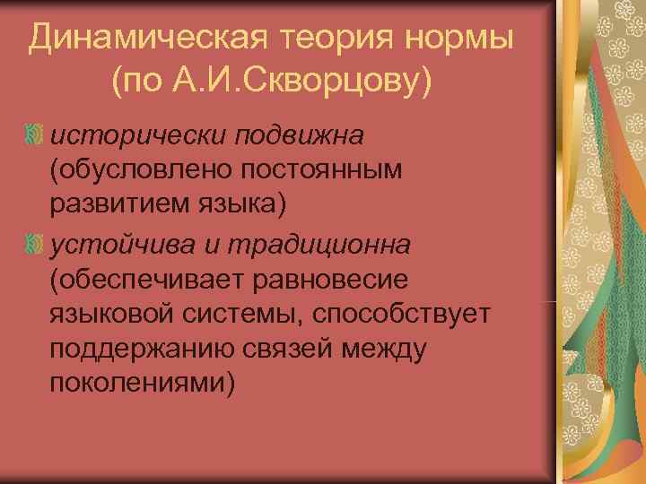 Динамическая теория нормы (по А. И. Скворцову) исторически подвижна (обусловлено постоянным развитием языка) устойчива и традиционна (обеспечивает равновесие языковой системы, способствует поддержанию связей между поколениями)
