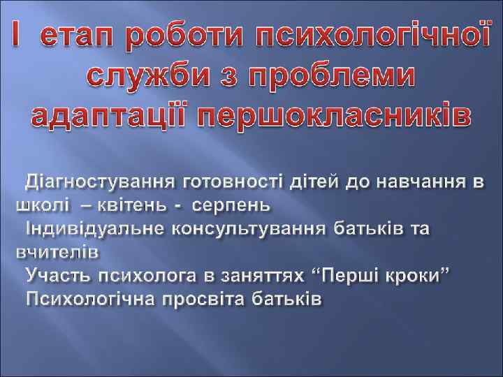 Діагностування першокласників: Анкета «Рівень шкільної мотивації» (Філіпса) Тест «Сходинки» Методика «Графічний диктант» (Ельконіна) Методика «Емоційний та фізичний стан дитини» (О. Осадько) Проективні методики