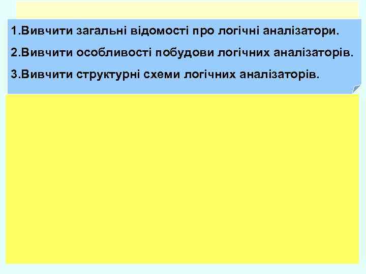 1. Вивчити загальні відомості про логічні аналізатори. 2. Вивчити особливості побудови логічних аналізаторів. 3. Вивчити структурні схеми логічних аналізаторів.