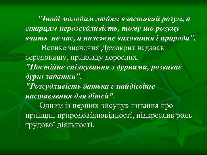 "Іноді молодим людям властивий розум, а старцям нерозсудливість, тому що розуму вчить не час, а належне виховання і природа". Велике значення Демокрит надавав середовищу, прикладу дорослих. "Постійне спілкування з дурними, розвиває дурні задатки". "Розсудливість батька є найдієвіше наставлення для дітей". Одним із перших висунув питання про принцип природовідповідності, підкреслив роль трудової діяльності.