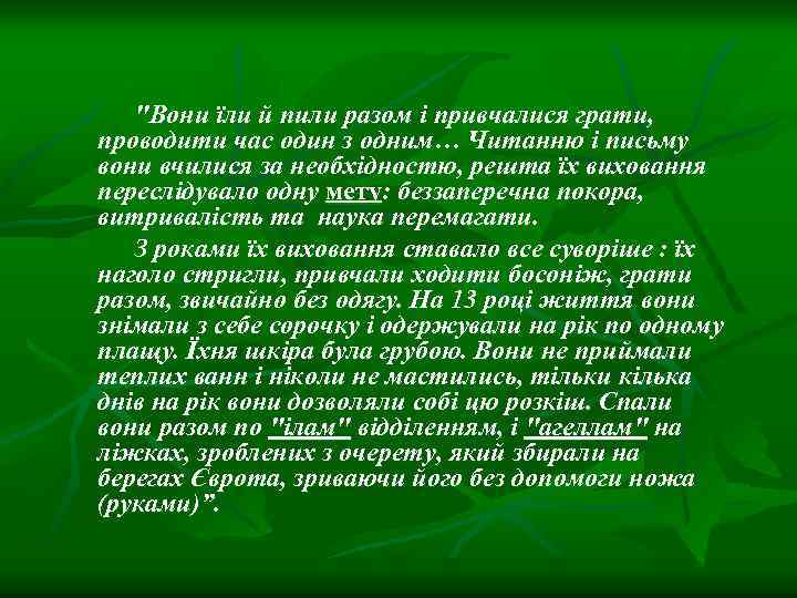 "Вони їли й пили разом і привчалися грати, проводити час один з одним… Читанню і письму вони вчилися за необхідностю, решта їх виховання переслідувало одну мету: беззаперечна покора, витривалість та наука перемагати. З роками їх виховання ставало все суворіше : їх наголо стригли, привчали ходити босоніж, грати разом, звичайно без одягу. На 13 році життя вони знімали з себе сорочку і одержували на рік по одному плащу. Їхня шкіра була грубою. Вони не приймали теплих ванн і ніколи не мастились, тільки кілька днів на рік вони дозволяли собі цю розкіш. Спали вони разом по "ілам" відділенням, і "агеллам" на ліжках, зроблених з очерету, який збирали на берегах Єврота, зриваючи його без допомоги ножа (руками)”.