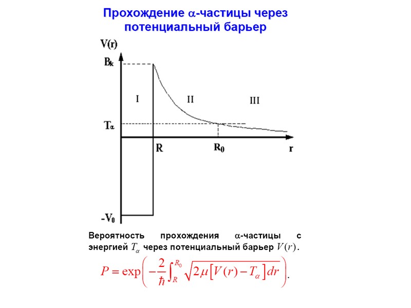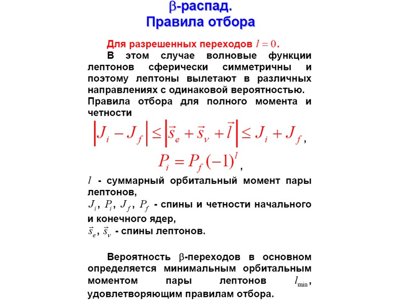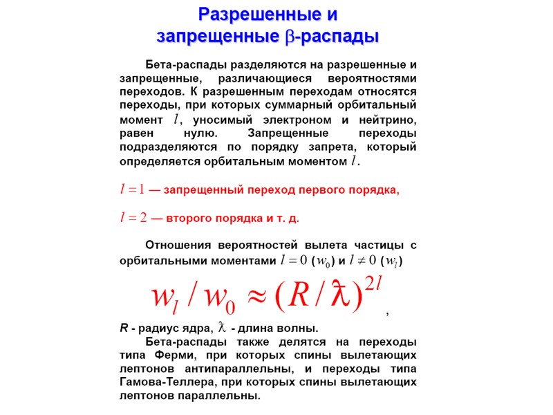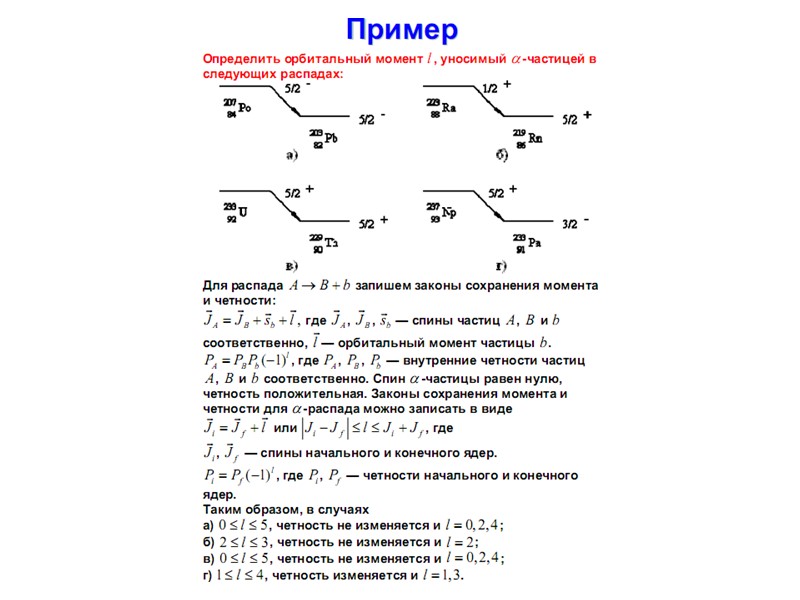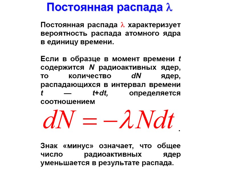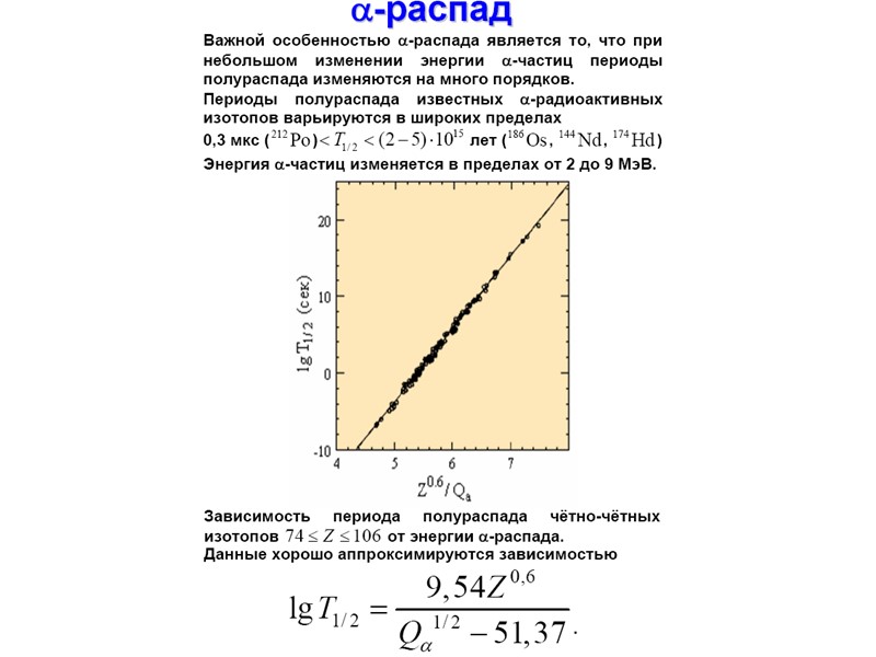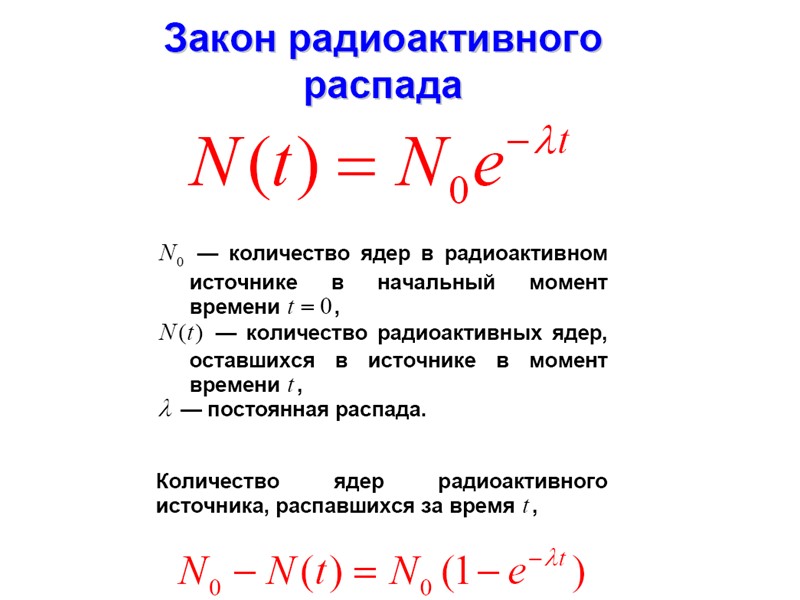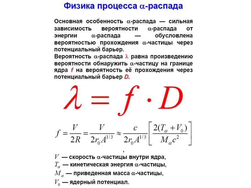 Радиоактивный распад Радиоактивный распад Основными видами радиоактивного распада являются: • α-распад – испускание ядрами α-частиц, • β-распад – испускание (или поглощение) лептонов, • γ-распад – испускание γ-квантов, • спонтанное деление – распад ядра на два осколка сравнимой массы. К более редким видам радиоактивного распада относятся испускание ядрами одного или двух протонов, а также испускание кластеров – лёгких ядер от 12С до 32S. Во всех видах радиоактивности (кроме гамма - радиоактивности) изменяется состав ядра – число протонов Z , массовое число А или то и другое одновременно.